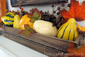 The crate is also made of paint sticks. I added a $3 bag of gourds, two .99 sprigs of berries, and a few fall leaves. The pine cones are from my yard. Click here to read more about the Fall crate and here for a tutorial on how to make a paint stick crate.